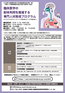 教育 献体による臨床医学研究プログラム協議会 Consortium for Clinical Cadaver Research Program (CCRP) 連携大学:北海道大学、京都大学、千葉大学 目標 わが国の喫緊の課題である献体使用を推進する人材育成を集中的に行い、献体使用による教育研究が“普通に”行われる学術環境を確立する 背景 2012年の「ガイドライン」公表後、献体を使用した手術手技研修(CST)が普及しつつあるが、臨床医学研究における献体使用は進んでいない。 その理由には人材不足がある: 献体保存法の選択から効率的な実施まで、CSTの適切な企画運営などのマネジメントができる人材 外科教育を医学研究として実施し、英文論文などの具体的な成果としてアウトカムを提示し、エビデンスを構築できる人材 献体を使用した医工連携の核となりプラットフォームを支える人材 期待される成果 外科教育、臨床解剖、医療機器開発それぞれに専門性を持つ、臨床医学の各分野での献体使用のマネジメントができる人材が養成される 研究基盤の醸成と育成人材の主導により、臨床医学・歯学、解剖学・医工学の各分野での献体を使用した医学研究の深化が得られる 大学院プログラムの共通科目化とインテンシブコースのe-learning化により、プログラム終了後も人材養成が継続される クリックでPDFをダウンロード クリックでPDFをダウンロード 履修証明プログラムのご案内 募集期間:2025年9月9日〜10月27日(期限厳守)プログラム実施期間:2025年11月〜2026年9月申込先:北海道大学医学研究院CCRP事務局 事務担当 CERIA[at]pop.med.hokudai.ac.jp [at]を@に変換してください。 ※フライヤーはこちら 11月開講R7年度後期—R8年度前期 履修証明プログラムのご案内 受講生の方へ 現在お知らせはありません。